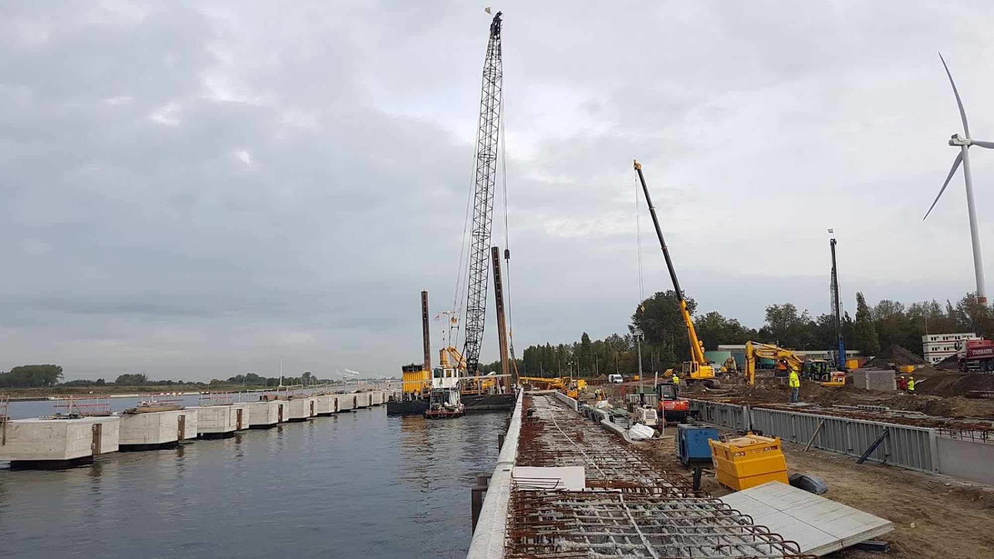 Verder plaatste HYE zowel stroomop- als stroomafwaarts de remmingswerken en geleidingsbuizen in het water. Aan het land werden dan nog oeverwanden gebouwd uit damplanken die werden verankerd met ankerbalken, ankerwand en passieve ankers. Ten slotte werden nog bolderbuizen verankerd met geboorde grondankers.